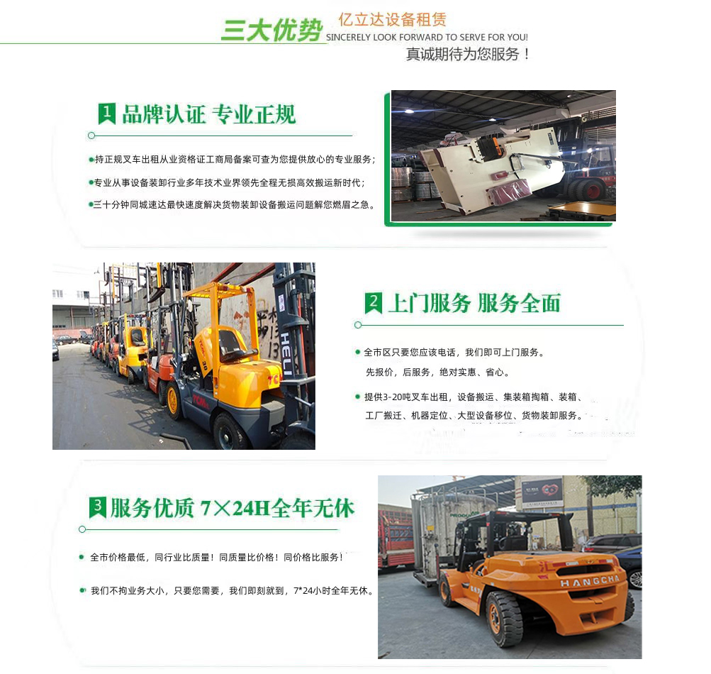 亿立达设备租赁有限公司是工商局准许的北京理工大学专业叉车出租公司,公司本着诚信、服务、效率、创新的经营理念,用精湛的技术,真诚的服务,为众多客户提供优质的服务,同时获得信赖与支持。专业提供北京理工大学3-20吨叉车出租、叉车租赁、设备搬运、集装箱掏箱装箱、机器移位定位、货物装卸、工厂搬迁、安全可靠,收费透明,价格便宜,随叫随到,24小时上门服务!本公司叉车吊车师傅对各种设备搬运装卸都有深刻探讨和研究。很多的疑难设备搬运,通过我公司的叉车师傅都能迎刃而解。对各种进口设备、国产机器、大型设备搬迁、高难度搬迁、各种精密仪器、医疗设备、科研设备等都能搬运; 提供全市 24 小时上门装卸搬运服务。同时提供厂房搬迁服务。 ...